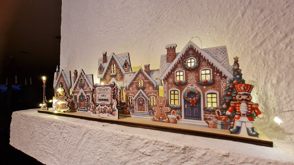 Tillverkad av förstklassig plywood och MDF, denna livliga byscen mäter 52 cm bred och är 17 cm hög, vilket gör den idealisk för visning på en hylla eller fönsterbräda. De utskurna fönstren gör att du kan placera LED-ljus bakom scenen, vilket ger ett varmt, mysigt sken som väcker pepparkaksbyn till liv.