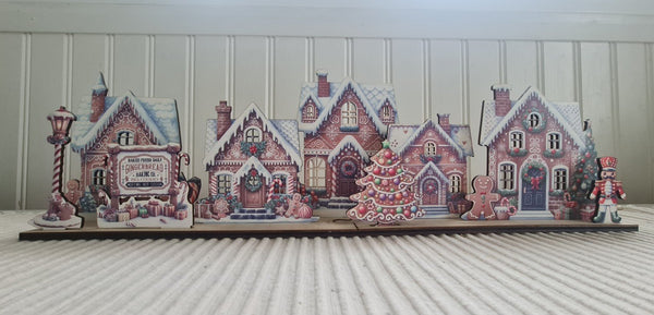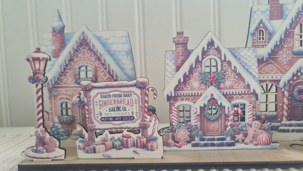 Skapa ett nyckfullt vinterunderland i ditt hem med vår handgjorda laserskurna pepparkaksbyscen. Denna förtjusande dekoration har en serie charmiga pepparkakshus, kompletta med en pepparkaksjulgran, en nötknäpparinspirerad pepparkaksgubbe och en bageriskylt bredvid en gatlykta med godisrör. Varje hus är vackert dekorerat med "glasyr" i en festlig vintermiljö, perfekt för att sprida julglädje.