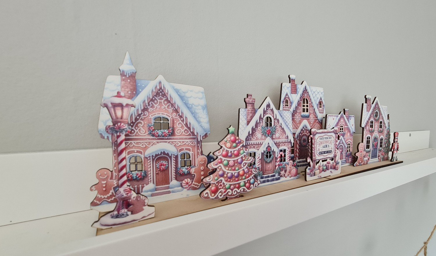 Skapa ett nyckfullt vinterunderland i ditt hem med vår handgjorda laserskurna pepparkaksbyscen. Denna förtjusande dekoration har en serie charmiga pepparkakshus, kompletta med en pepparkaksjulgran, en nötknäpparinspirerad pepparkaksgubbe och en bageriskylt bredvid en gatlykta med godisrör. Varje hus är vackert dekorerat med "glasyr" i en festlig vintermiljö, perfekt för att sprida julglädje.