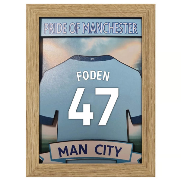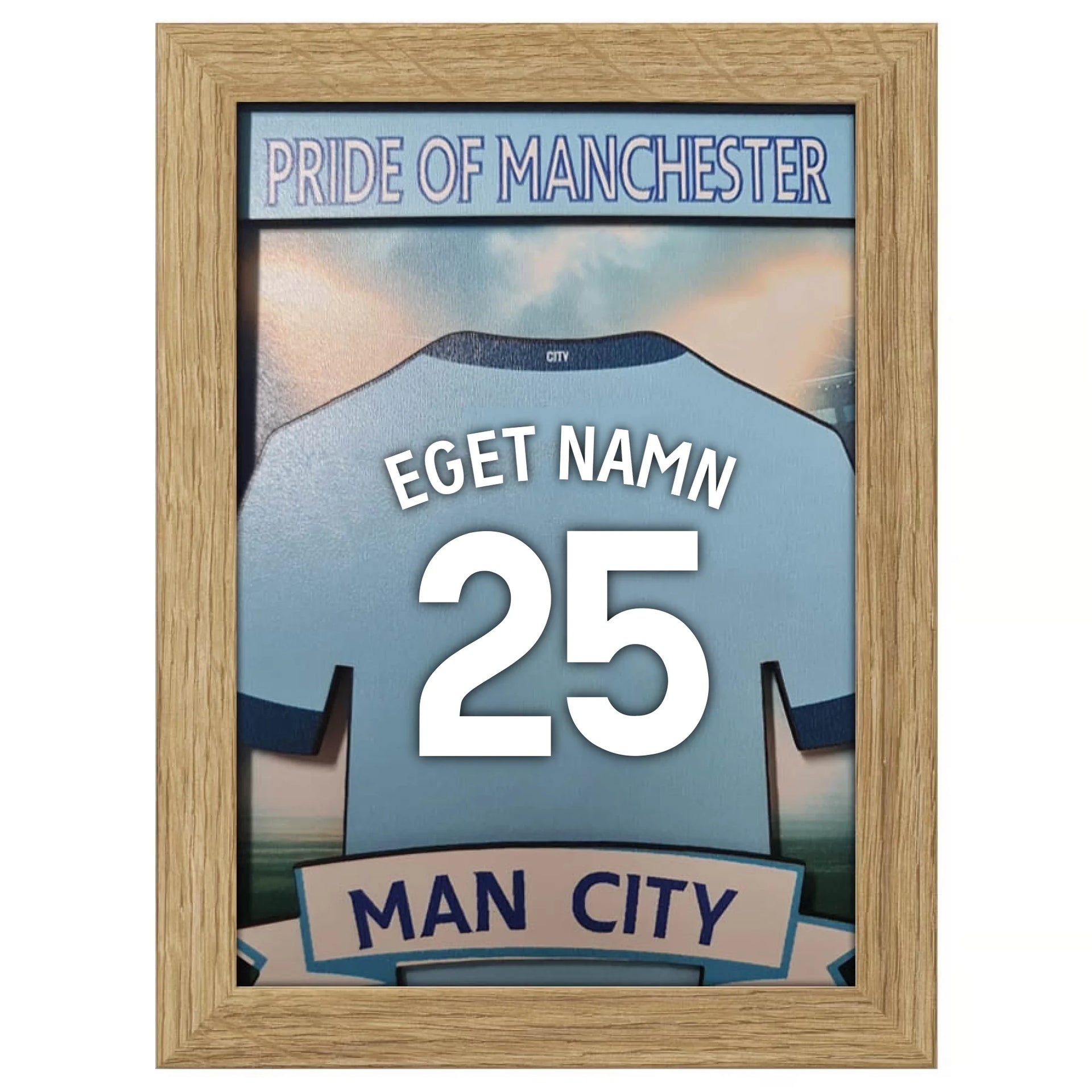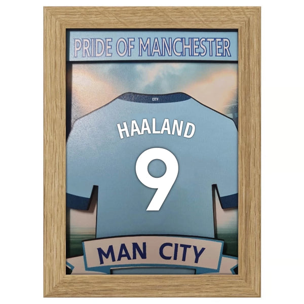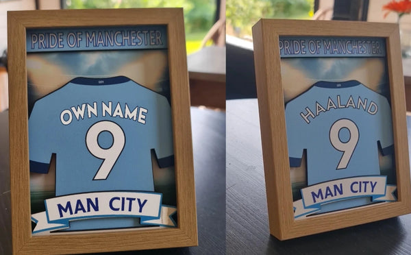 | Available Product | 3D-tröjram i Manchester City-stil – Personlig present till City-fans | Anpassat namn och nummer | Etihad Stadium Display | Haaland 9 eller egen |