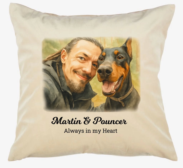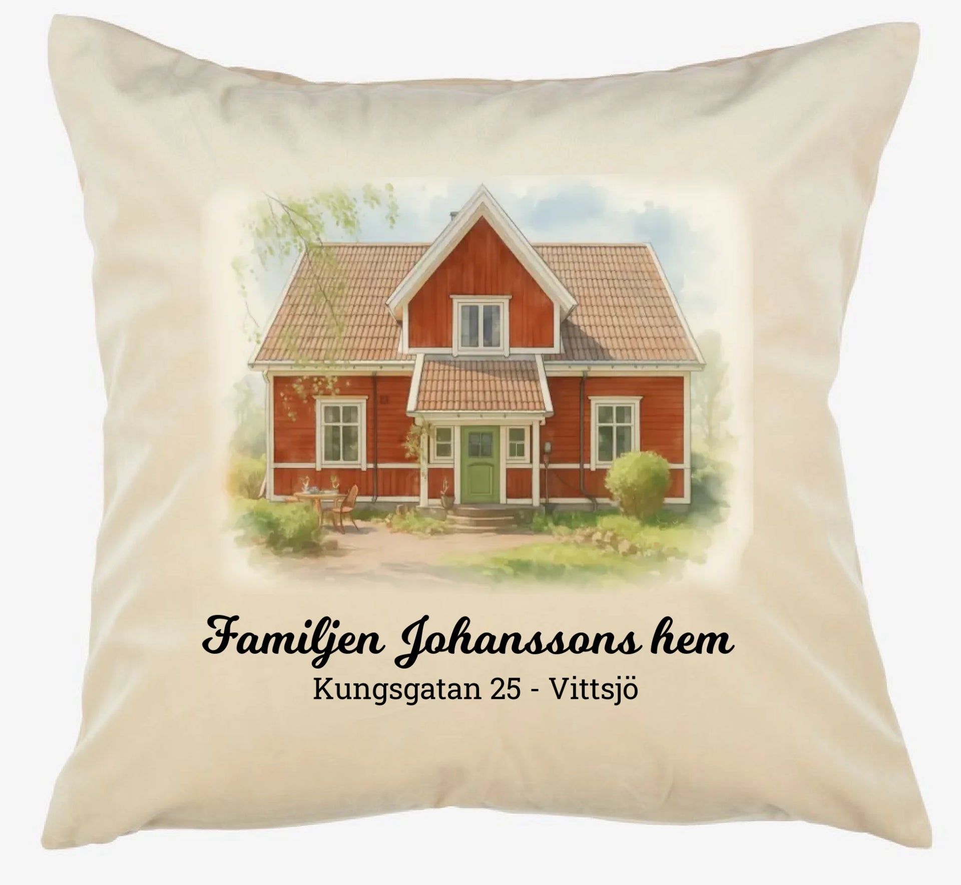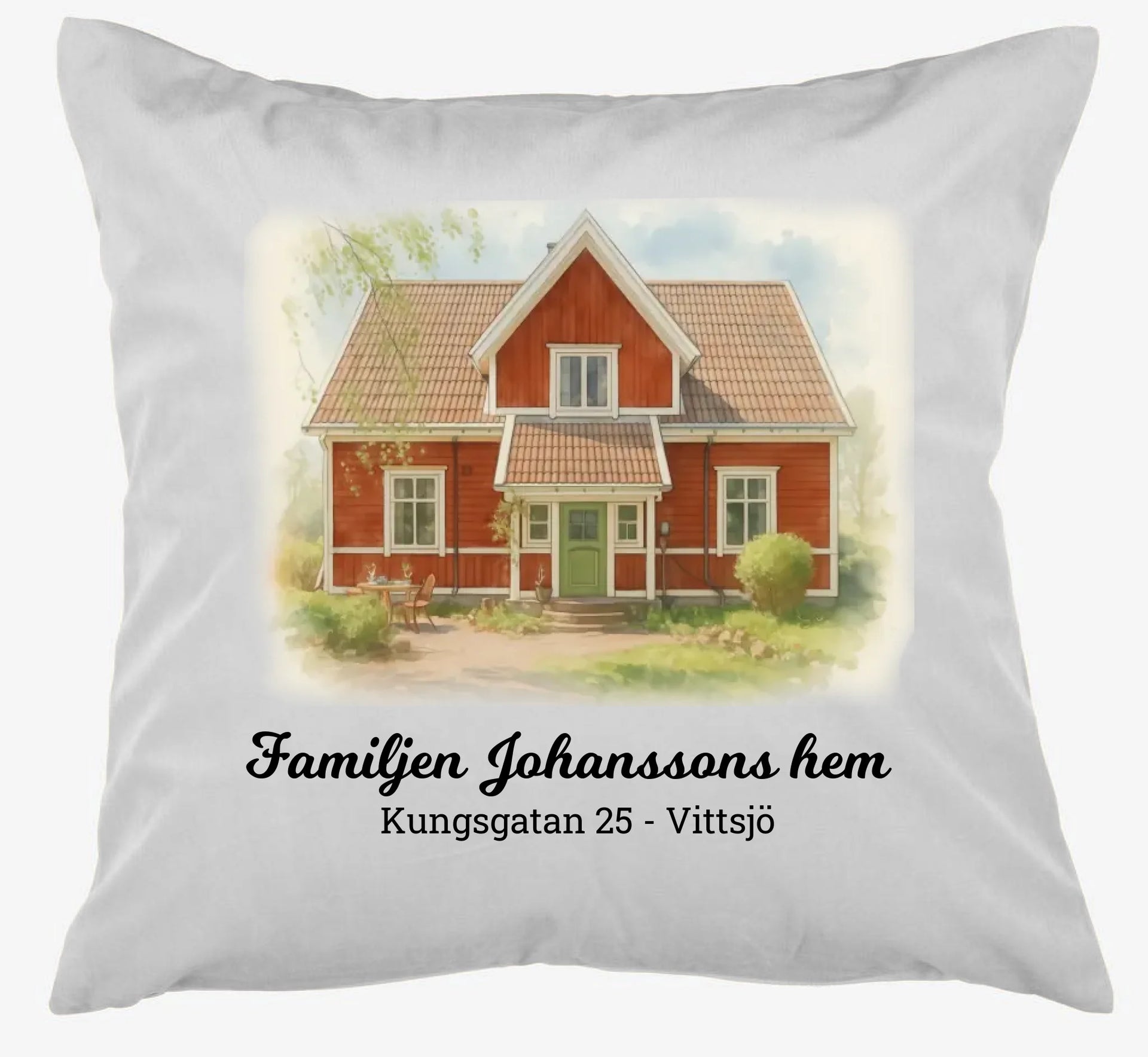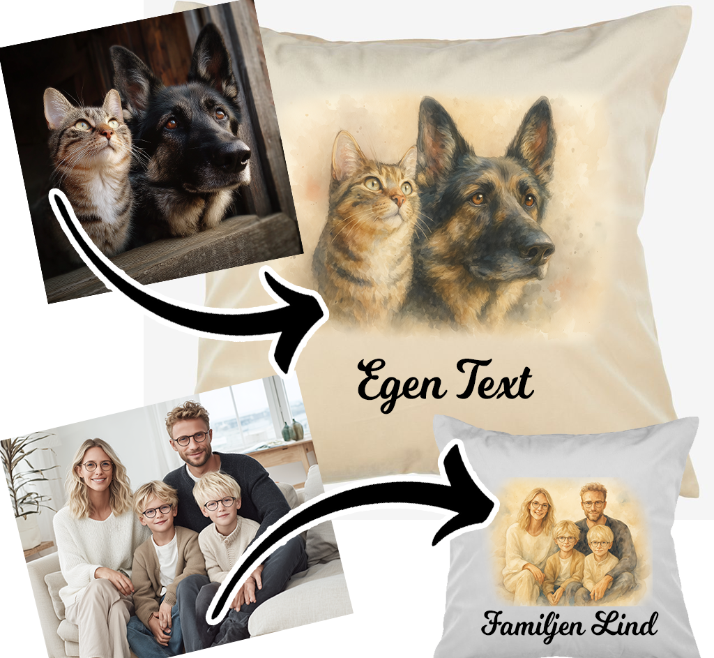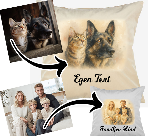 Gör ditt hem ännu mer personligt med en unik kudde där ditt eget foto omvandlas till en vacker akvarellillustration – perfekt för gåvor, minnen och heminredning.