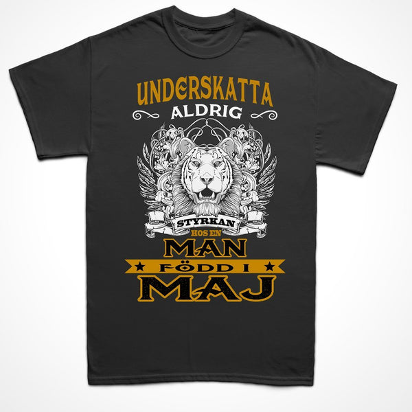 Svart T-shirt med text : Underskatta aldrig styrkan hos en man född i maj