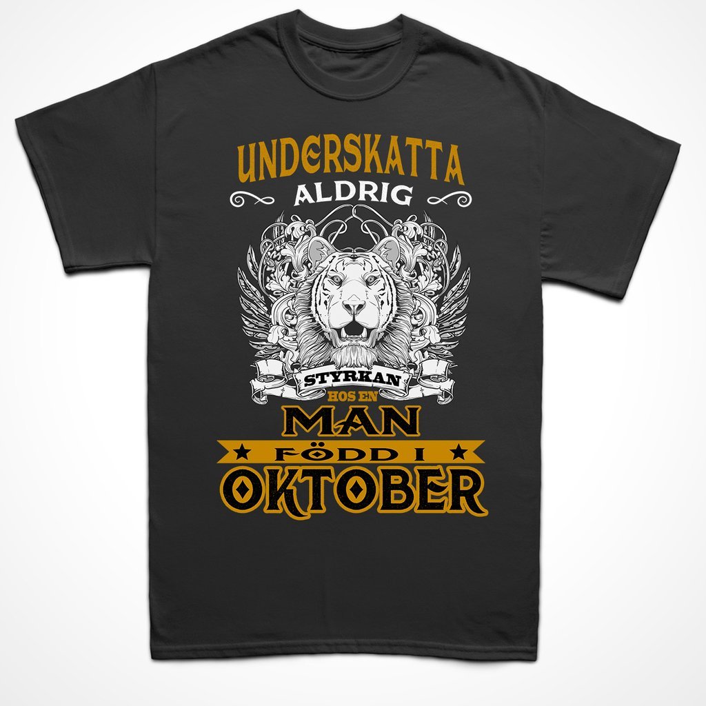 Svart T-shirt med text : Underskatta aldrig styrkan hos en man född i oktober