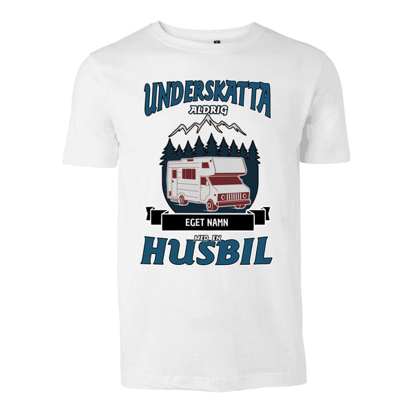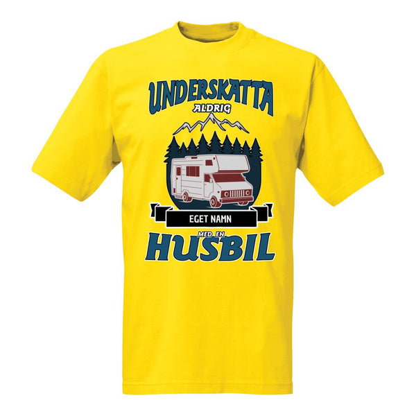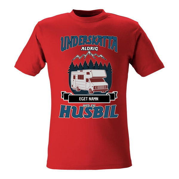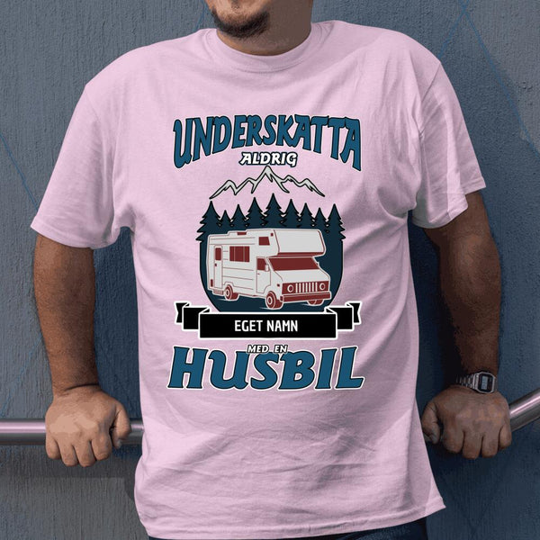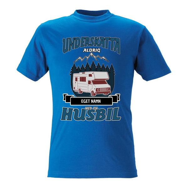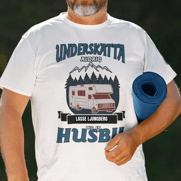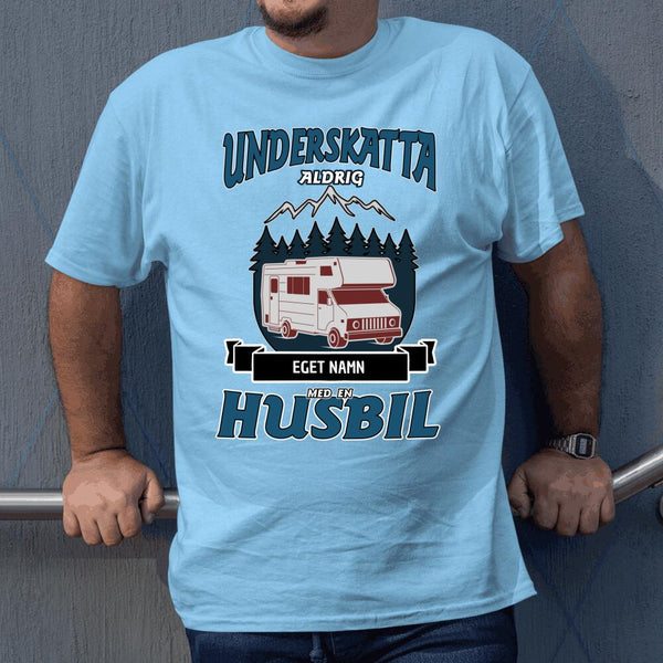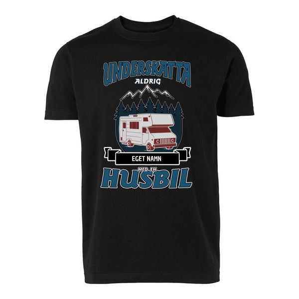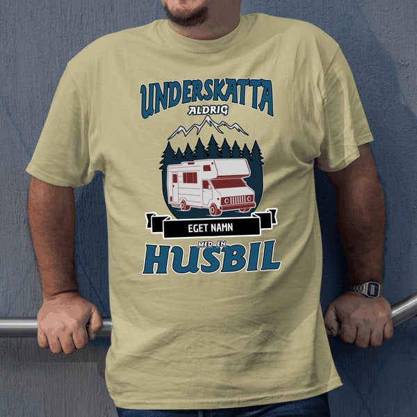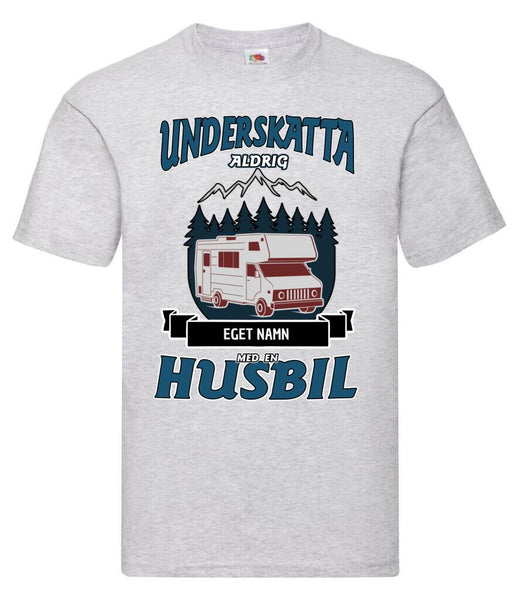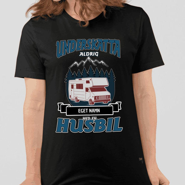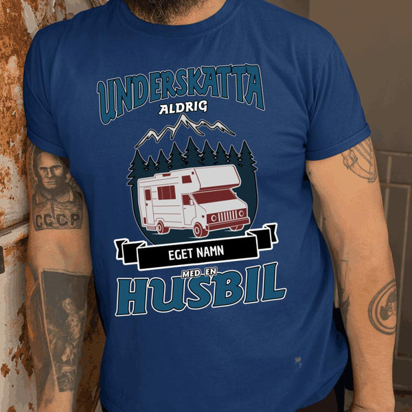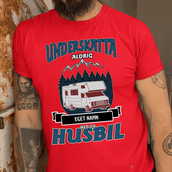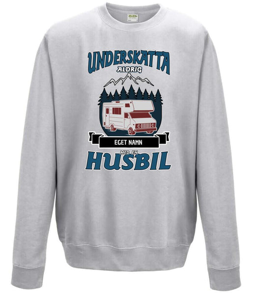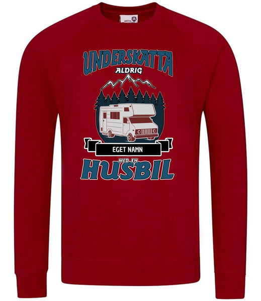 T-shirt eller sweatshirt med Underskatta aldrig......husbil tryck och eget personligt namn tryck