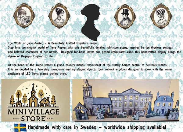 Kliv in i Jane Austens eleganta värld med denna vackert detaljerade miniatyrscen, inspirerad av de tidlösa miljöerna och älskade karaktärerna i hennes romaner. Designad för både bokälskare och tidsentusiaster, denna handgjorda display väcker charmen med Regency England till liv.