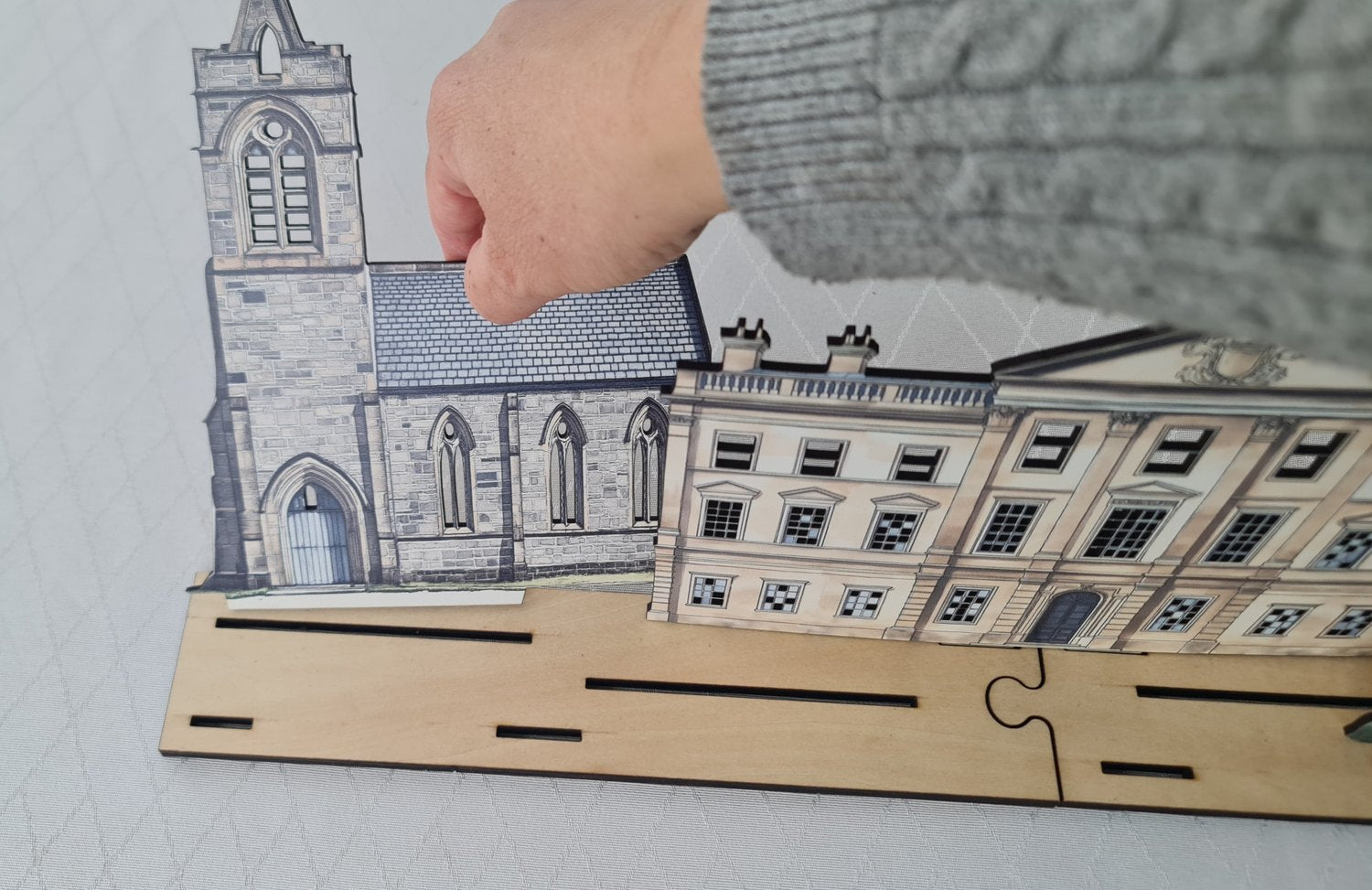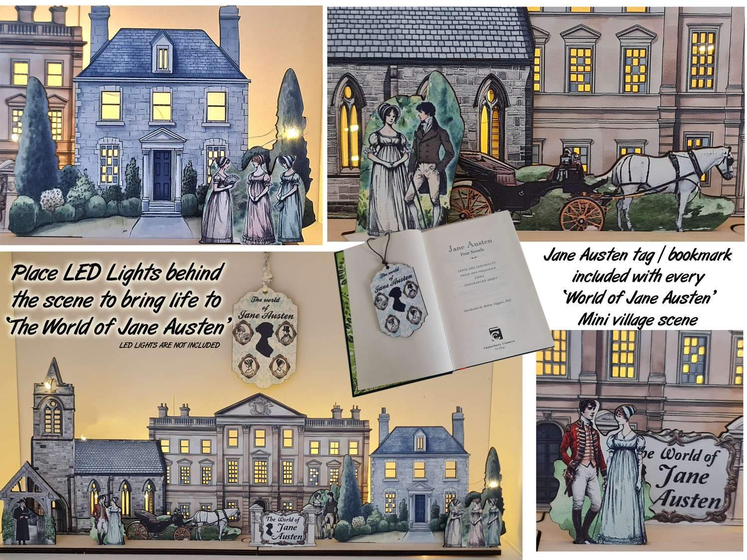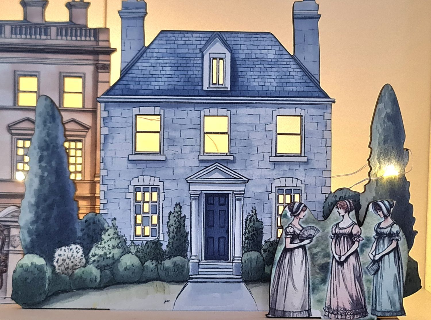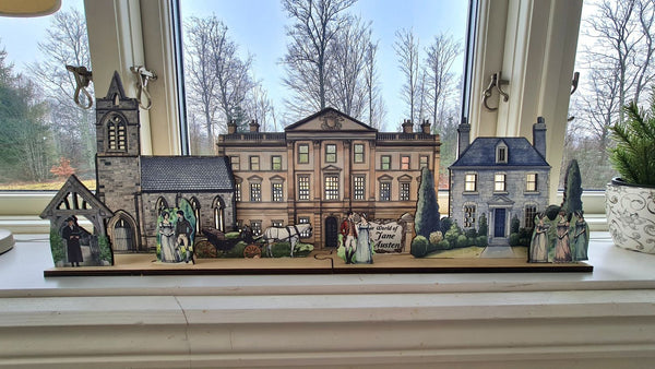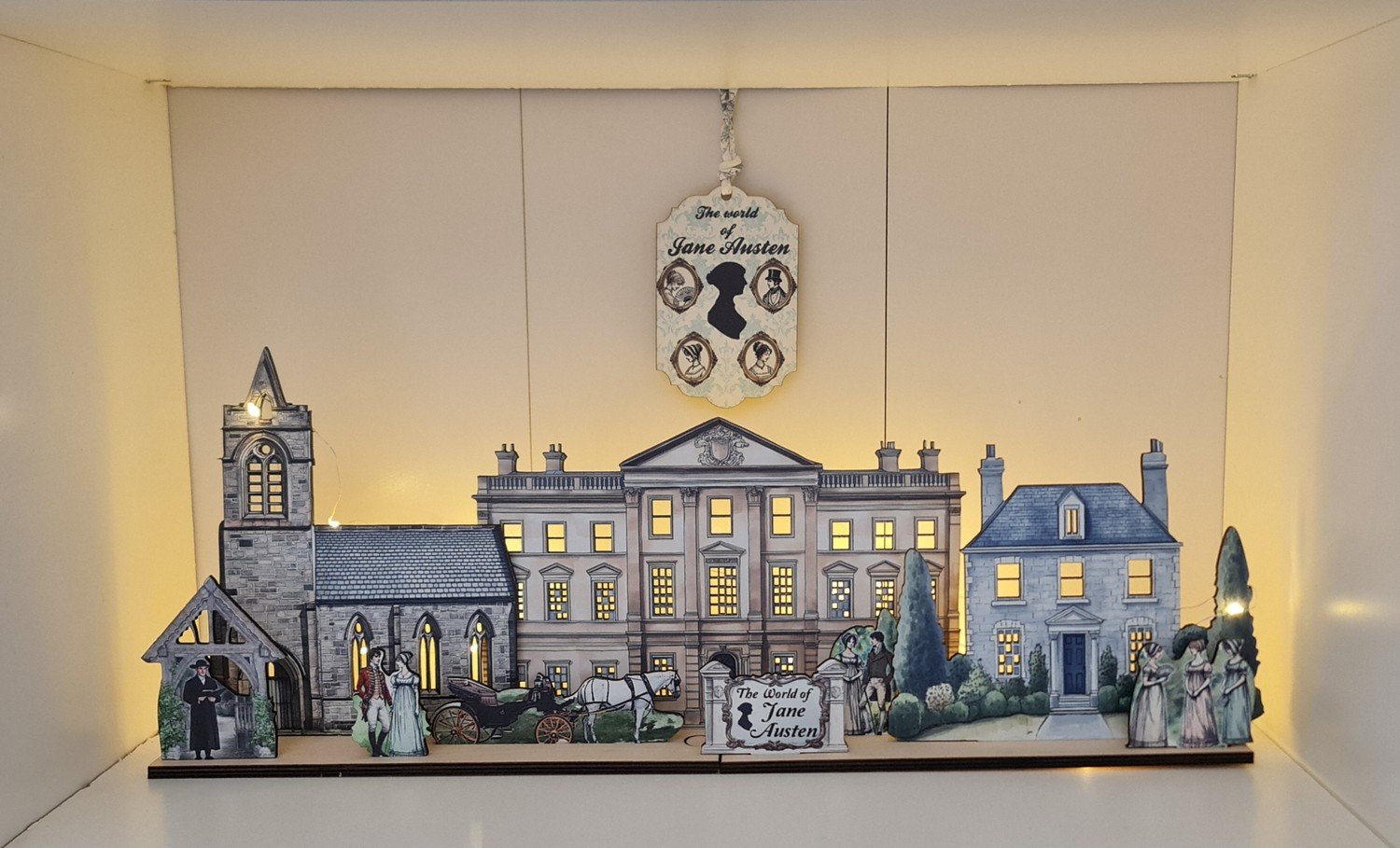 I hjärtat av scenen står en storslagen herrgård som påminner om de ståtliga husen som är centrala i Austens berättelser. Det är omgivet av ett georgiskt radhus och en elegant kyrka, deras utskurna fönster designade att lysa med den varma atmosfären av LED-ljus placerade bakom dem.