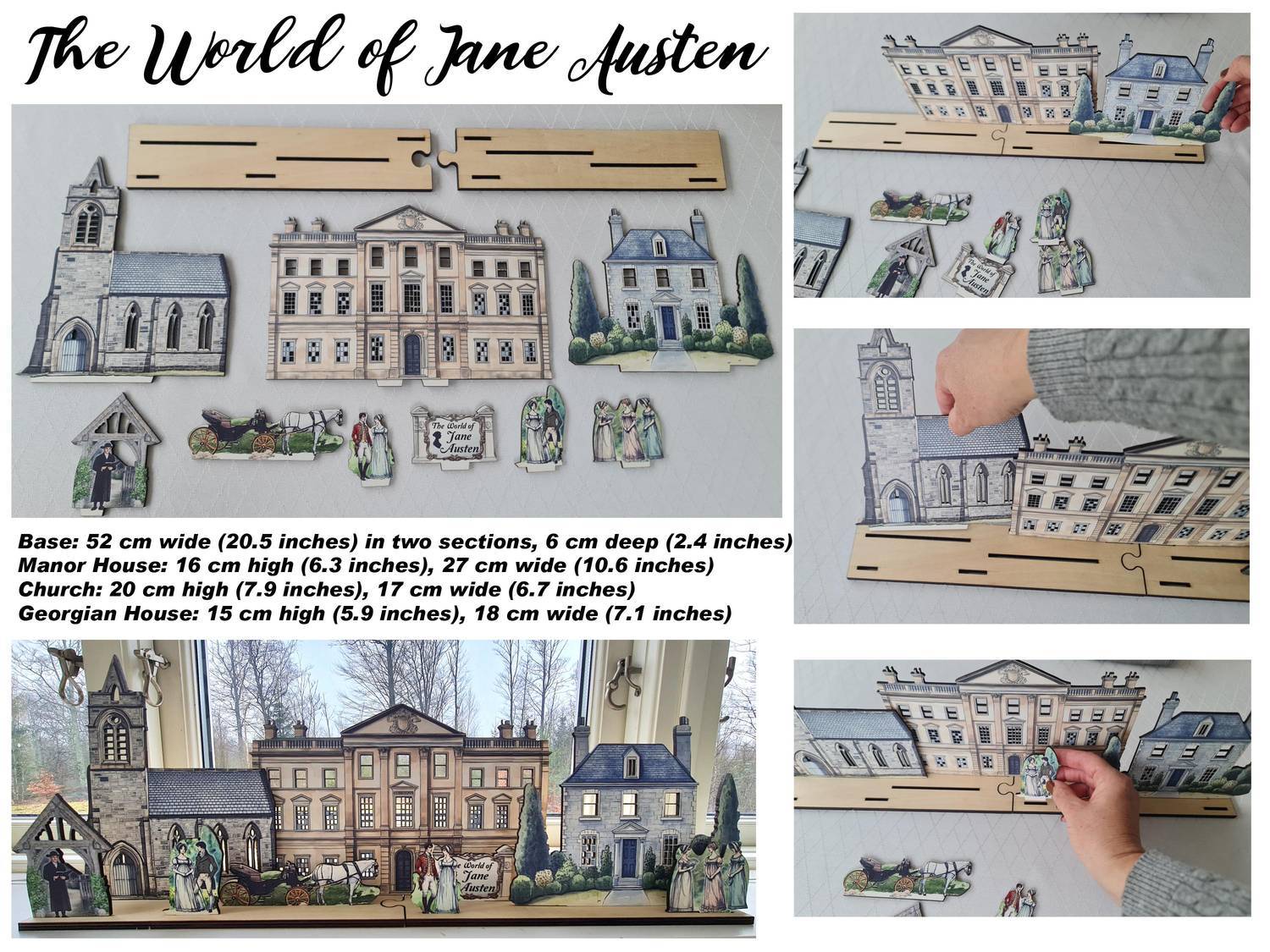Tillverkad av 3 mm fullfärgstryckt laserskuren hårdpapp, varje del är noggrant designad för att framkalla Austens fantasivärld. Setet är placerat i en robust 6 mm plywoodbas, vilket möjliggör en stabil och anpassningsbar display på bokhyllor, hyllor eller fönsterbrädor.