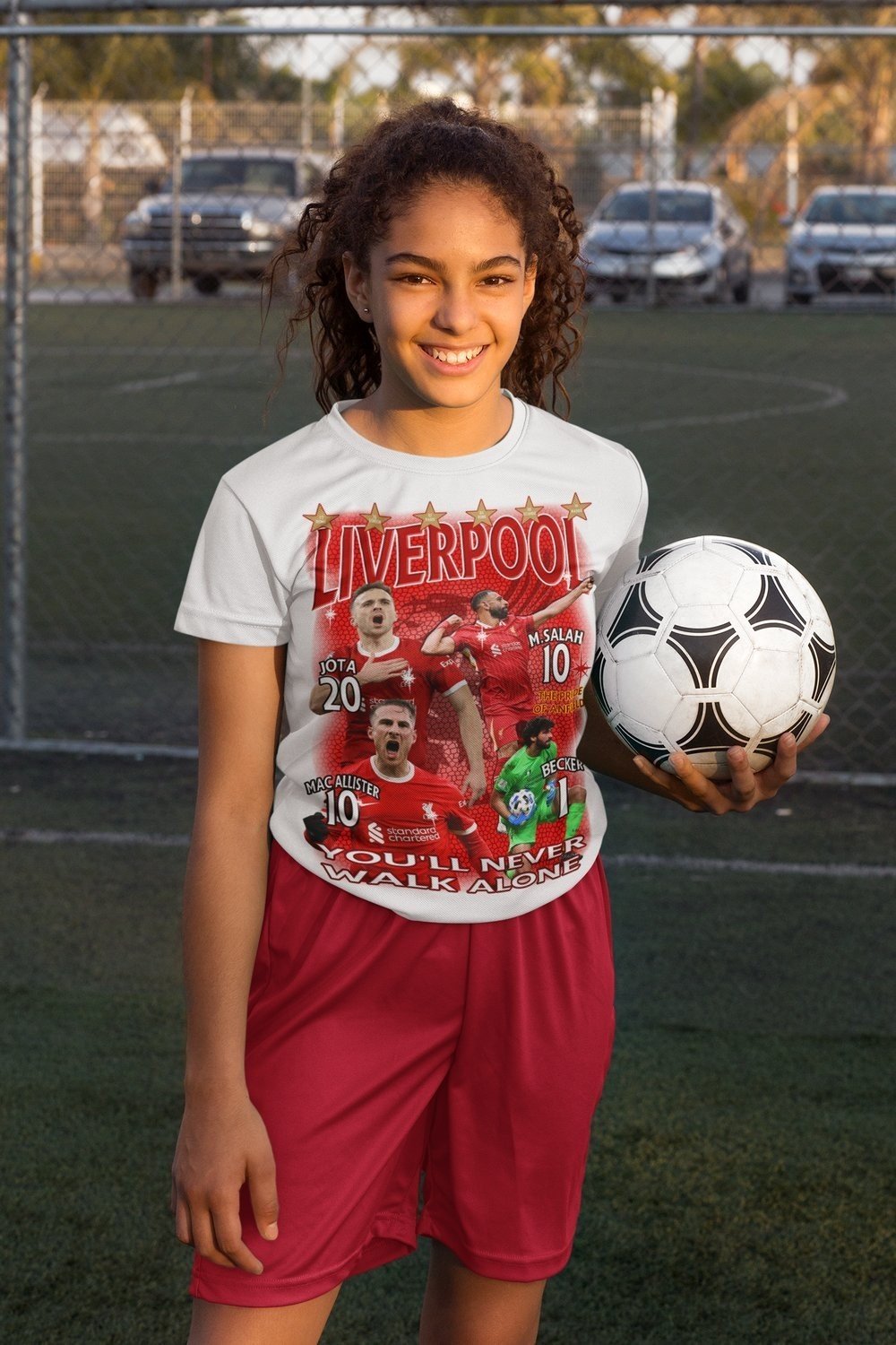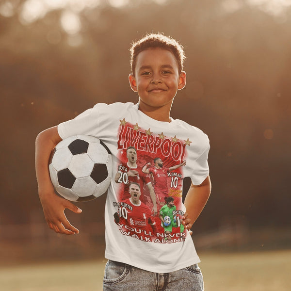 Vit Liverpool T-shirt med Färgstarkt Tryck - Mac allister - Jota - Salah - Becker design