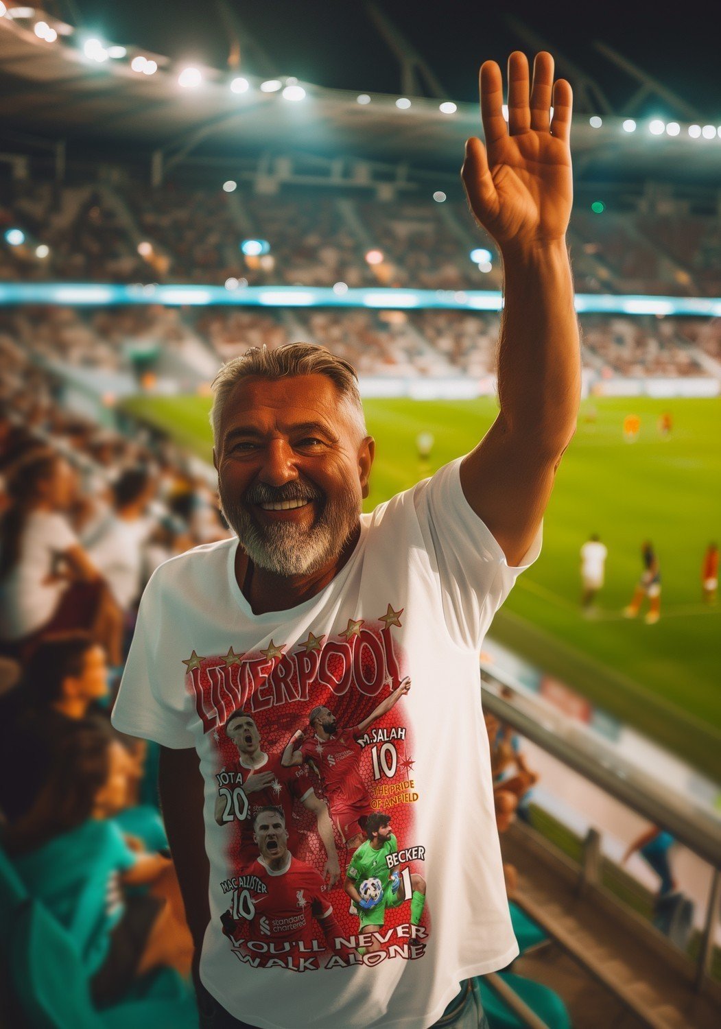 Denna supermjuka sporttröja är tillverkad i 100% polyester för maximal komfort och andningsförmåga. Framsidan pryds av ett livfullt tryck som hyllar Liverpool-spelarna Mac Allister, Jota, Salah och målvakten Becker. Perfekt för alla Liverpool-fans som vill visa sitt stöd på ett stilfullt och unikt sätt! Observera att denna T-shirt är 100% inofficiell merchandise och inte är kopplad till den officiella Liverpool FC.
