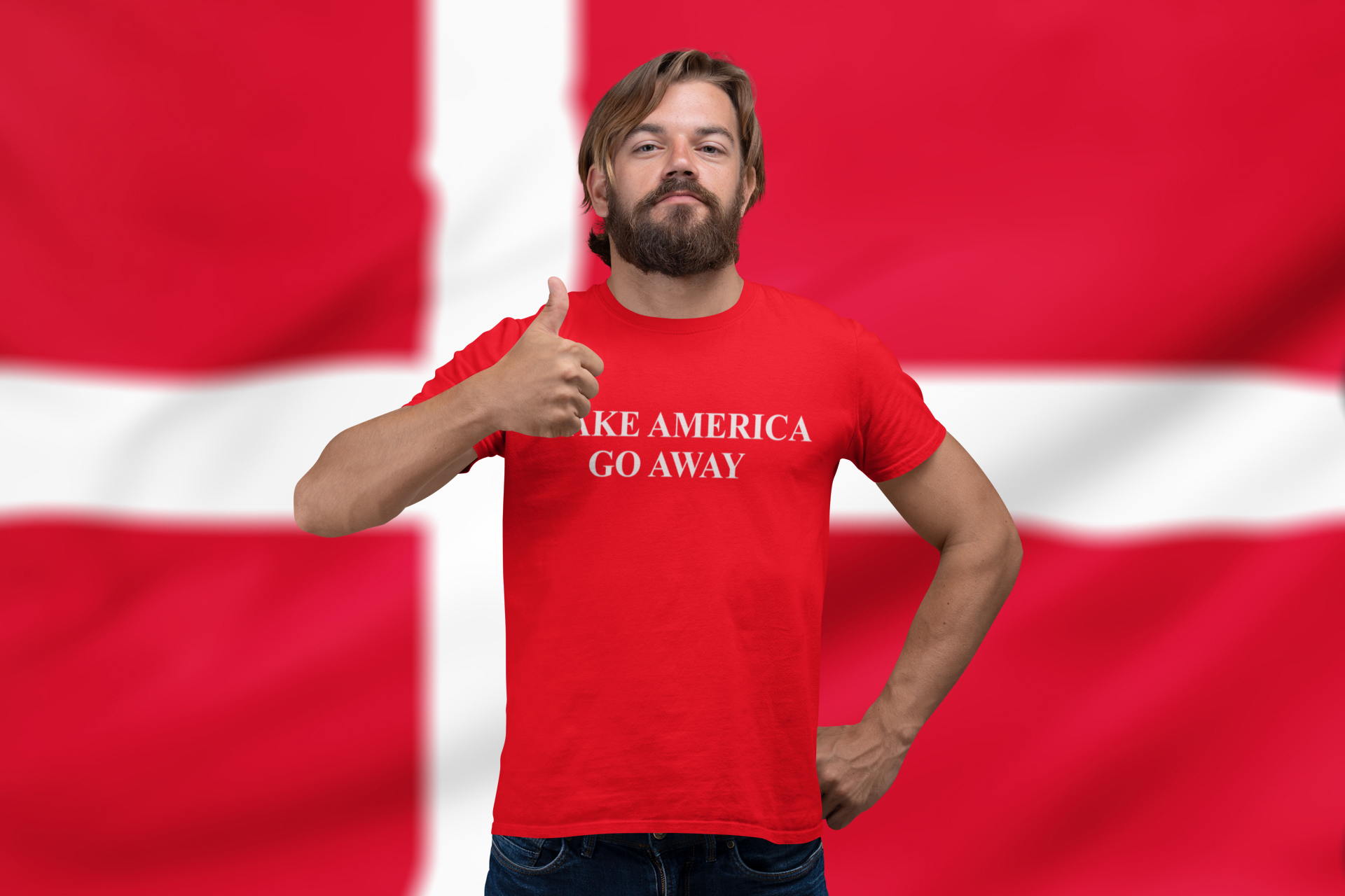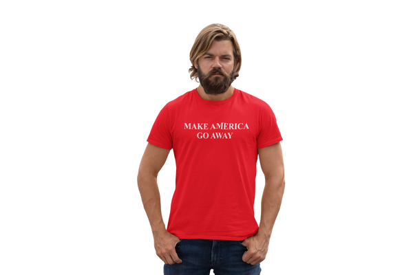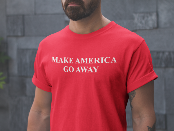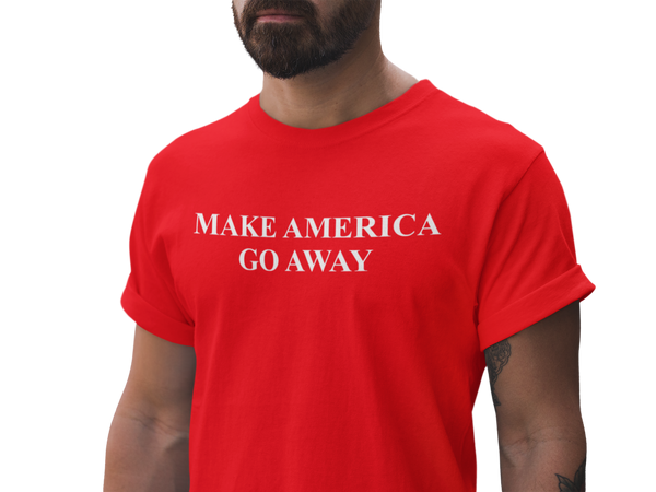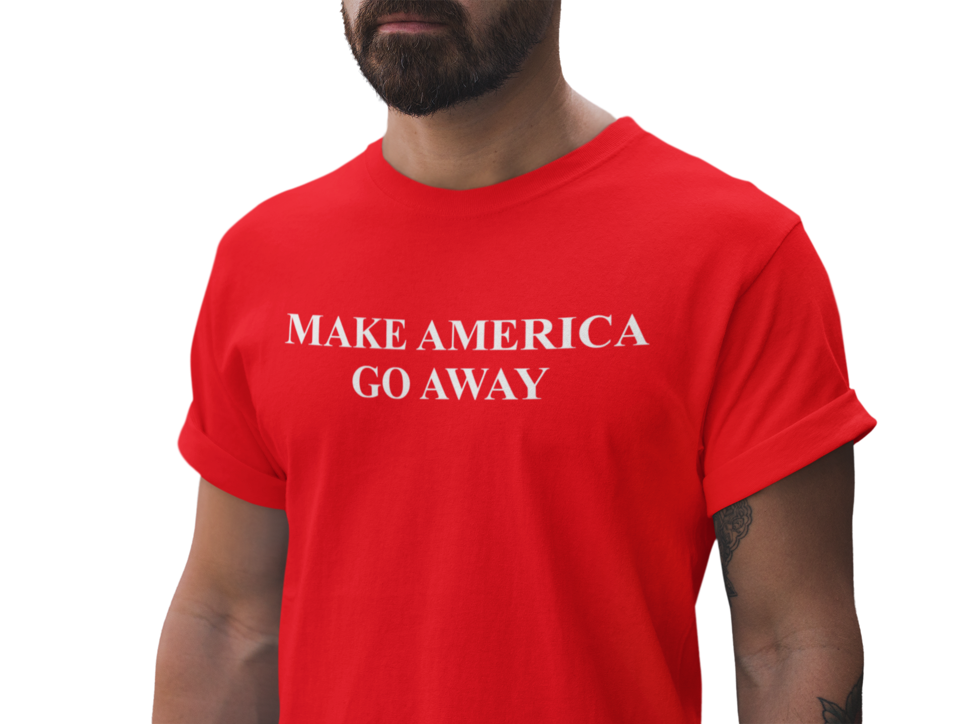 En röd t-shirt med ett tydligt, ironiskt budskap: “Make America Go Away”.