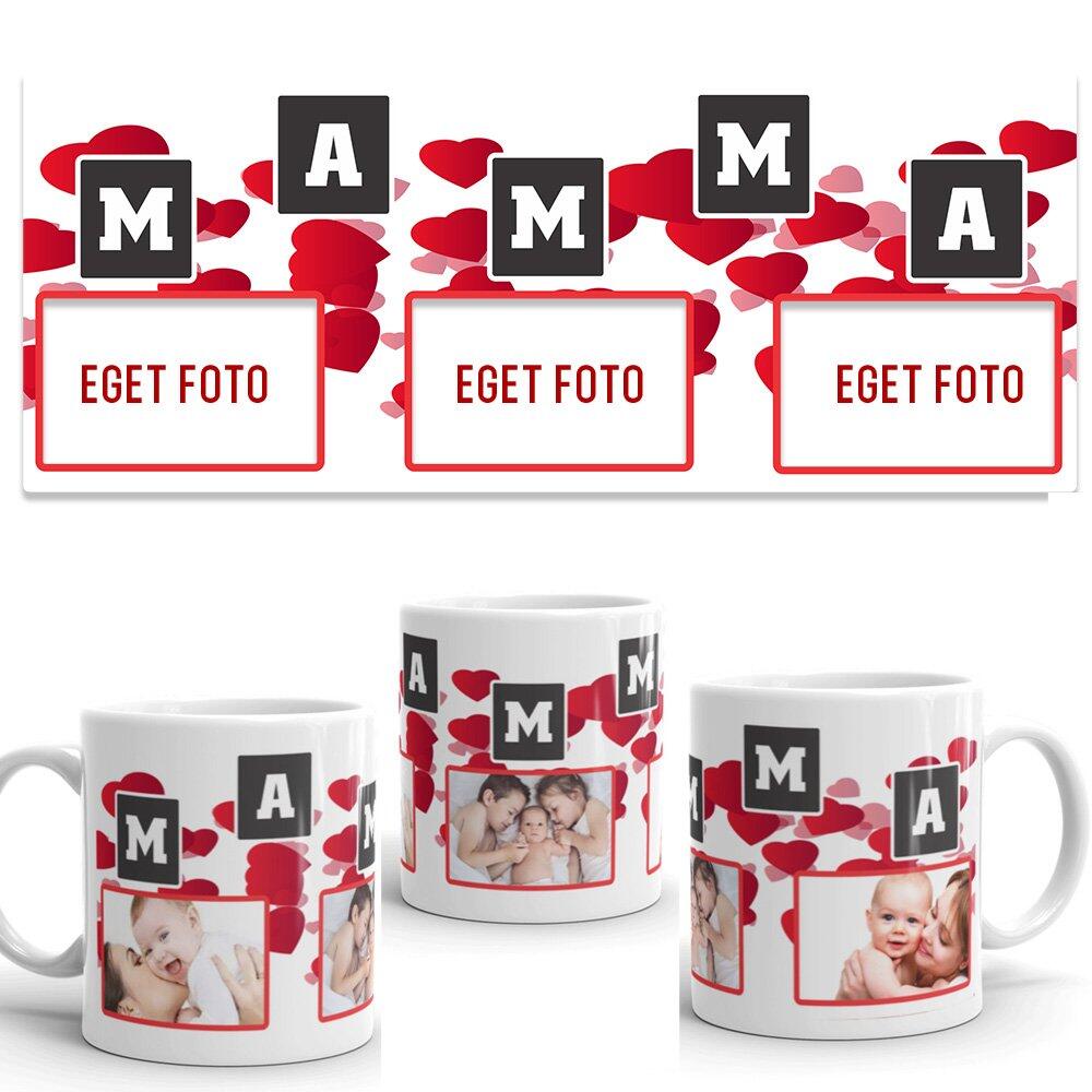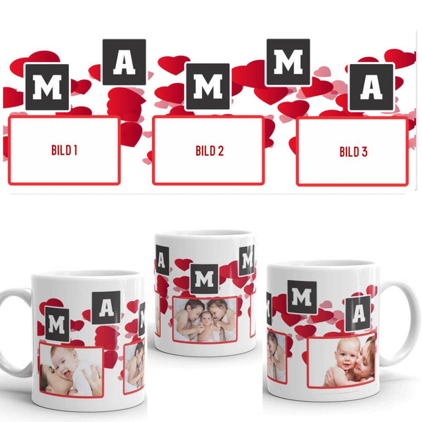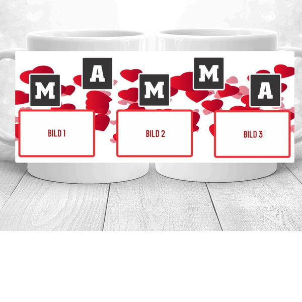 Gör mors dag extra speciell med en personlig mugg till mamma! Denna fina keramikmugg har plats för tre av dina egna bilder som trycks in i en vacker design – perfekt för att visa upp minnen, familj eller kanske några roliga ögonblick ni haft tillsammans.