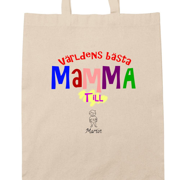 Shopping tygkasse av stadig och bra kvalitet. Tryck med Världens bästa Mamma till - välj eget namntryck på väskan. Du väljer vilka tecknade figurer du önskar och namnen, tom husdjur med namn kan läggas till! Mycket rymlig och slittålig, håller för tunga varor. Spara på miljön och bär hem det du handlar i denna fina väska istället för i plast/papperskassar! Perfekt present till mamma!