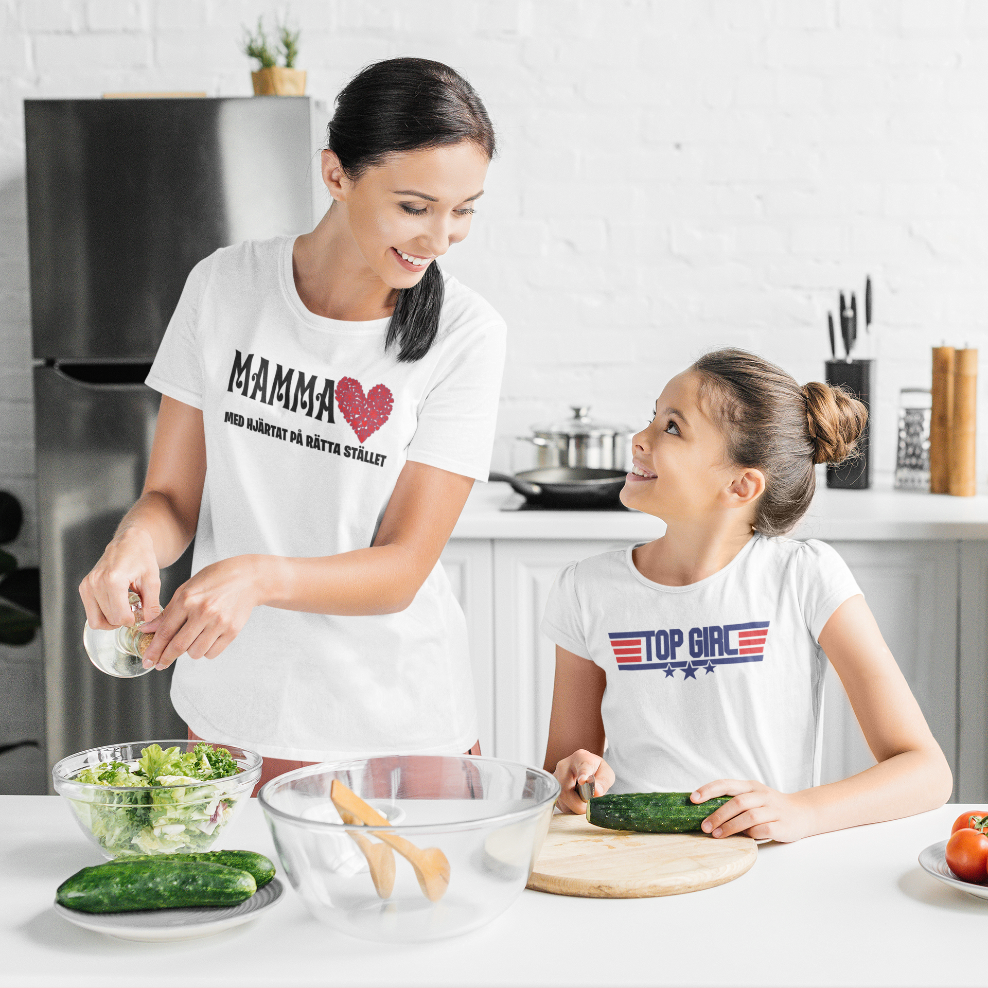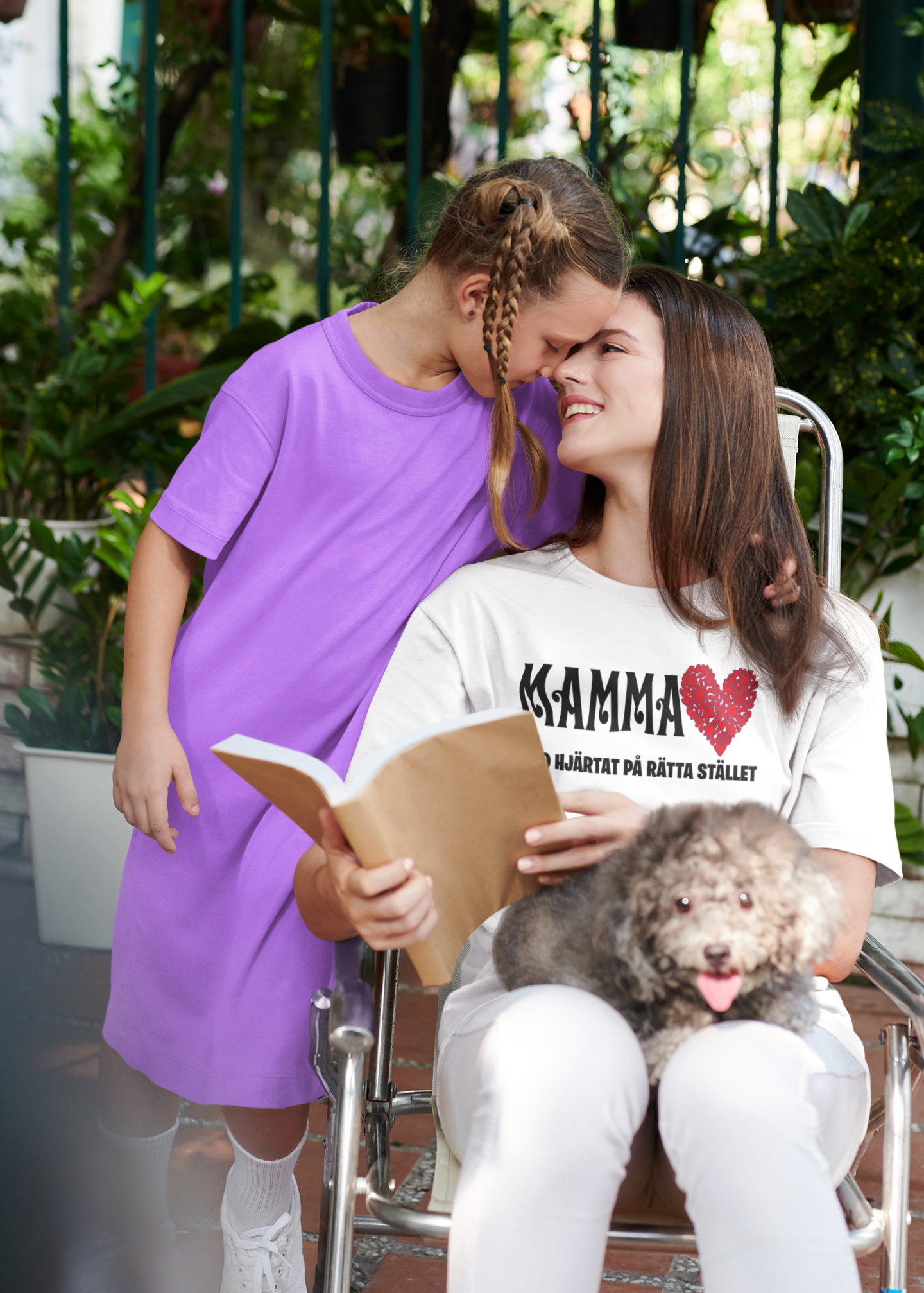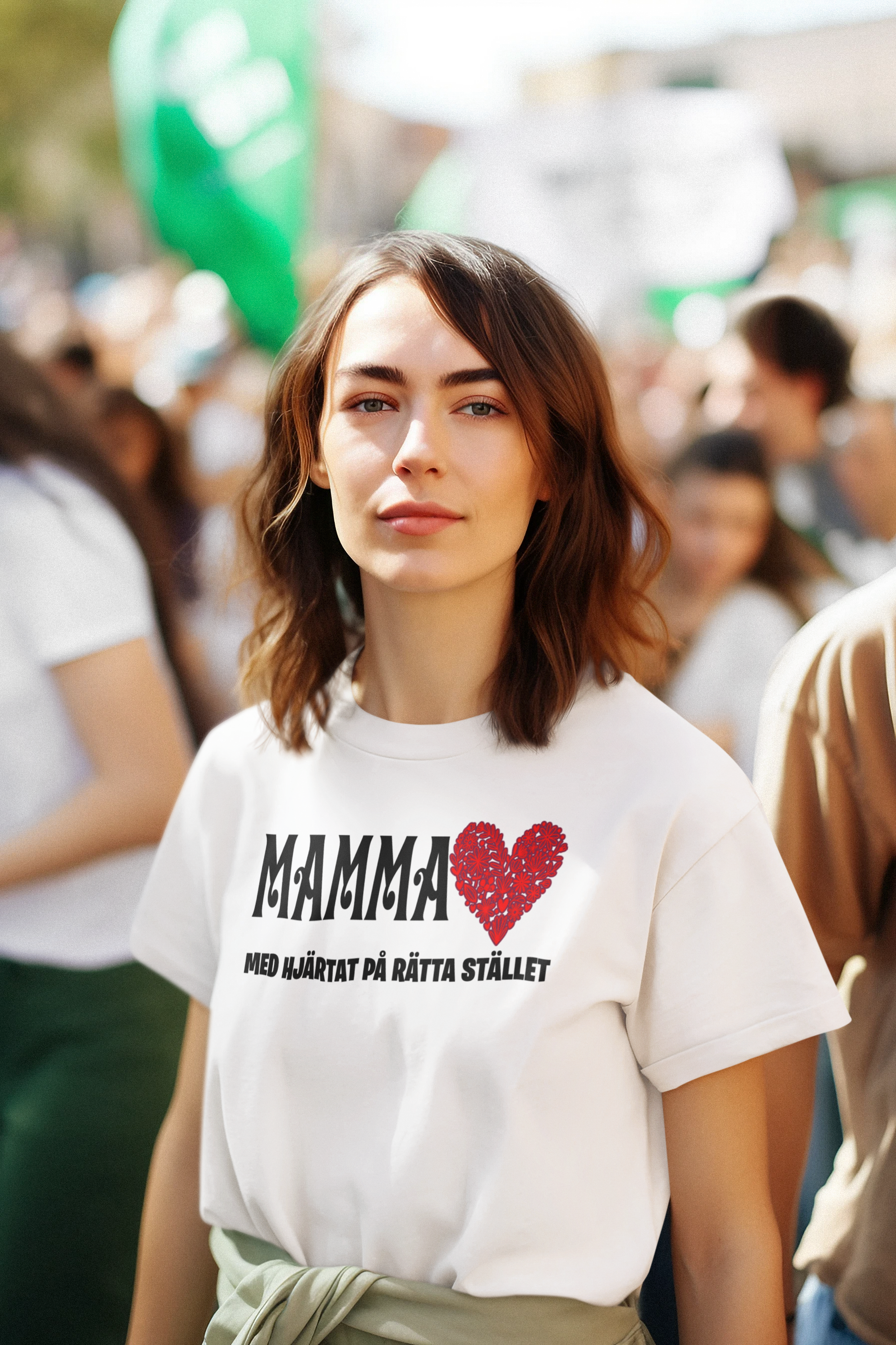 En stilren och kärleksfull t-shirt med ett hjärtmotiv och texten "med hjärtat på rätta stället". Perfekt för att hylla alla fantastiska mammor där ute – oavsett om det är till Mors dag, födelsedag eller bara för att visa uppskattning.