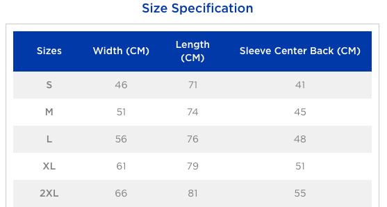 SizesWidth (CM)Length (CM)Sleeve Center Back (CM)S467141M517445L567648XL6179512XL6681553XL718458