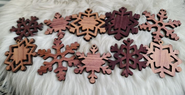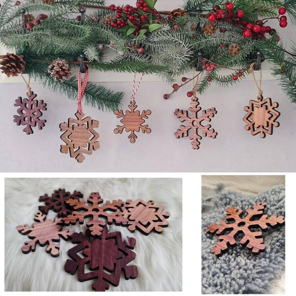 Ge din juldekoration en rustik känsla med detta set om 10 rustika snöflingeprydnader i trä. Varje snöflinga har en unik design och en vacker naturlig träådring på båda sidor. De är perfekta att hänga som solitärdekorationer eller på julgranen.