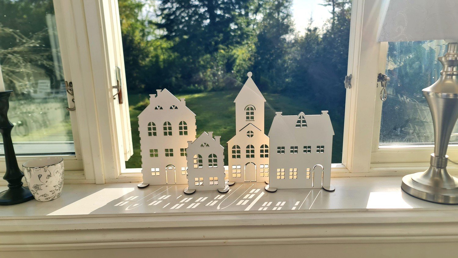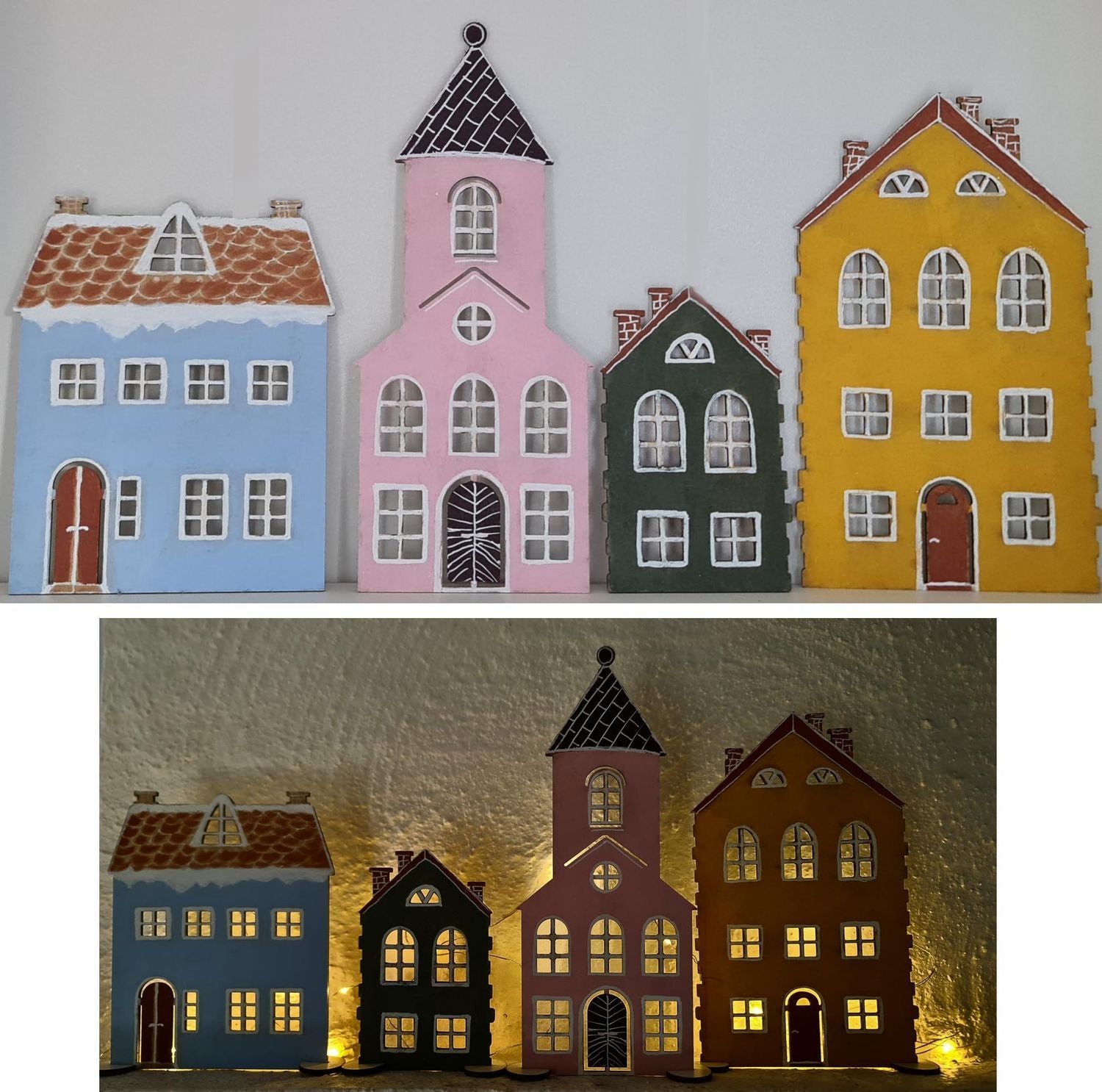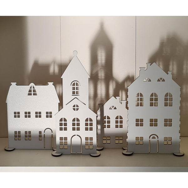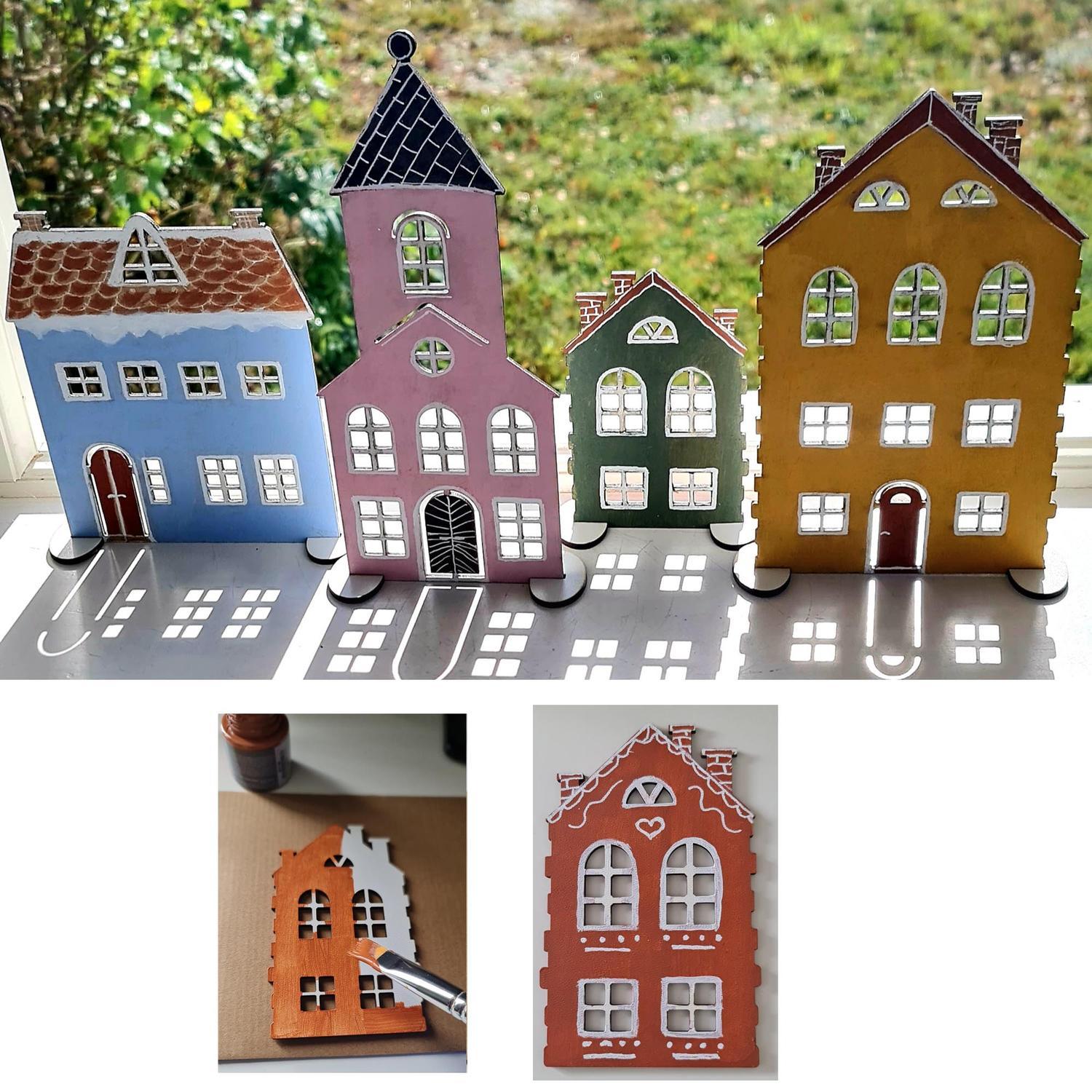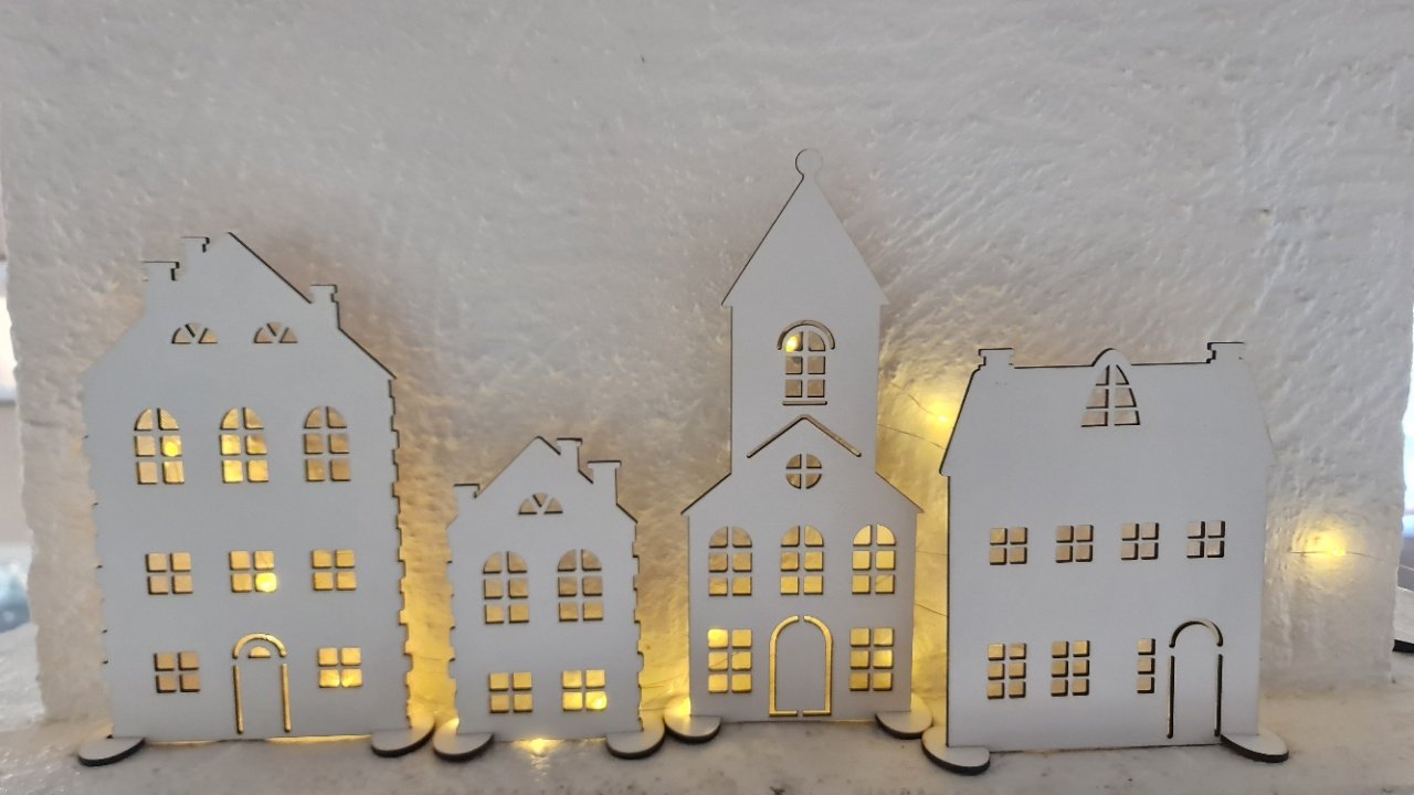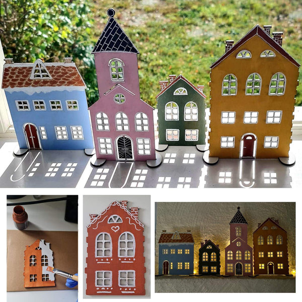 Husen är noggrant skurna från 3 mm MDF och har utskurna fönster som låter LED-ljus lysa igenom och skapa ett varmt, inbjudande sken när mörkret faller. Varje hus står stadigt på sina medföljande fötter, vilket gör det enkelt att placera dem på en hylla, fönsterbräda eller annan plats där du vill ha dem.
