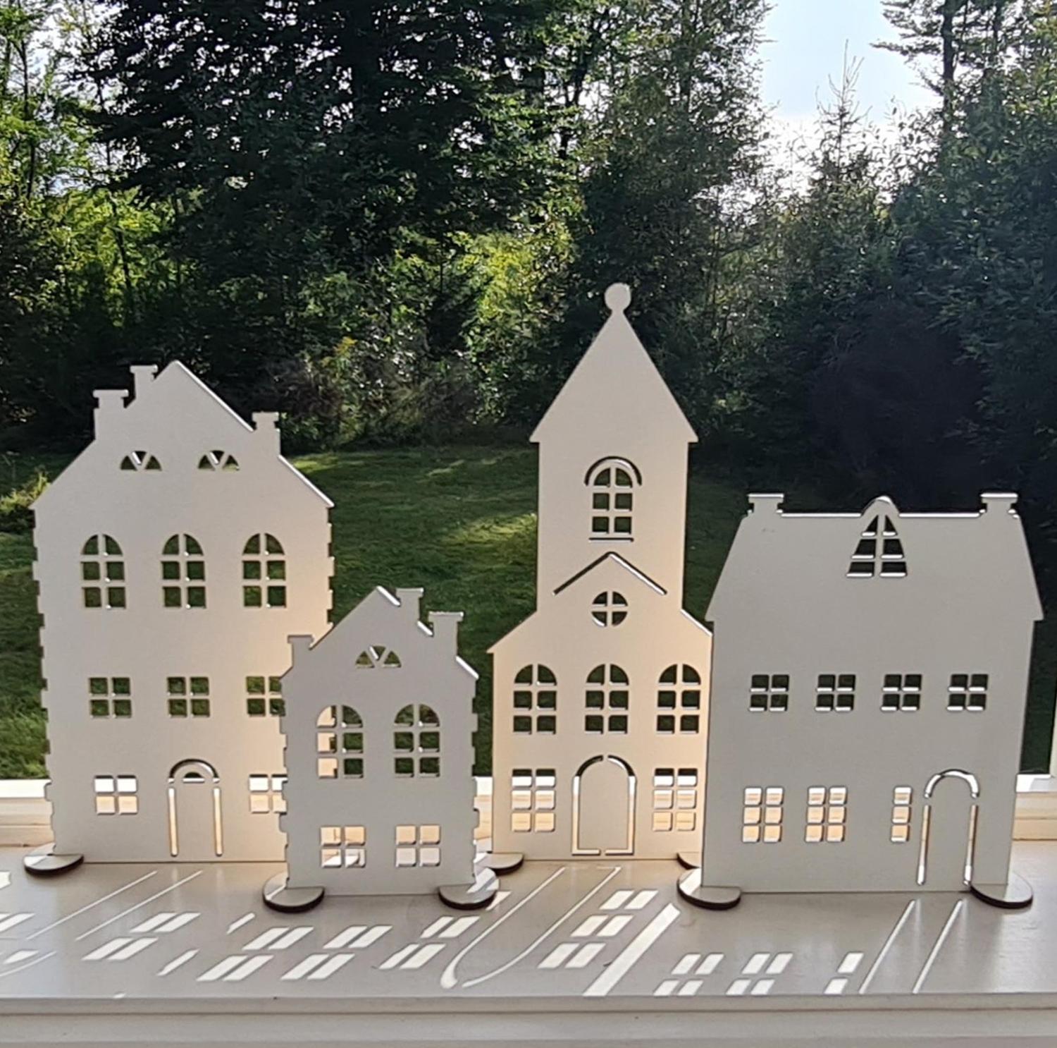 Skarpa en mysig atmosfär i ditt hem med detta set av 4 laserskurna hus, perfekta för att skapa en upplyst liten by.