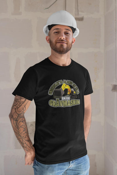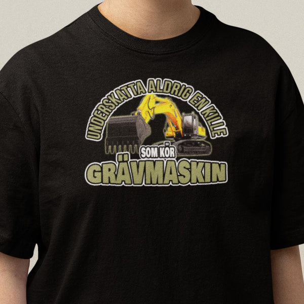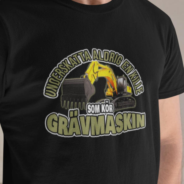 T-shirt med tryck :Underskatta aldrig en kille som kör grävmaskin