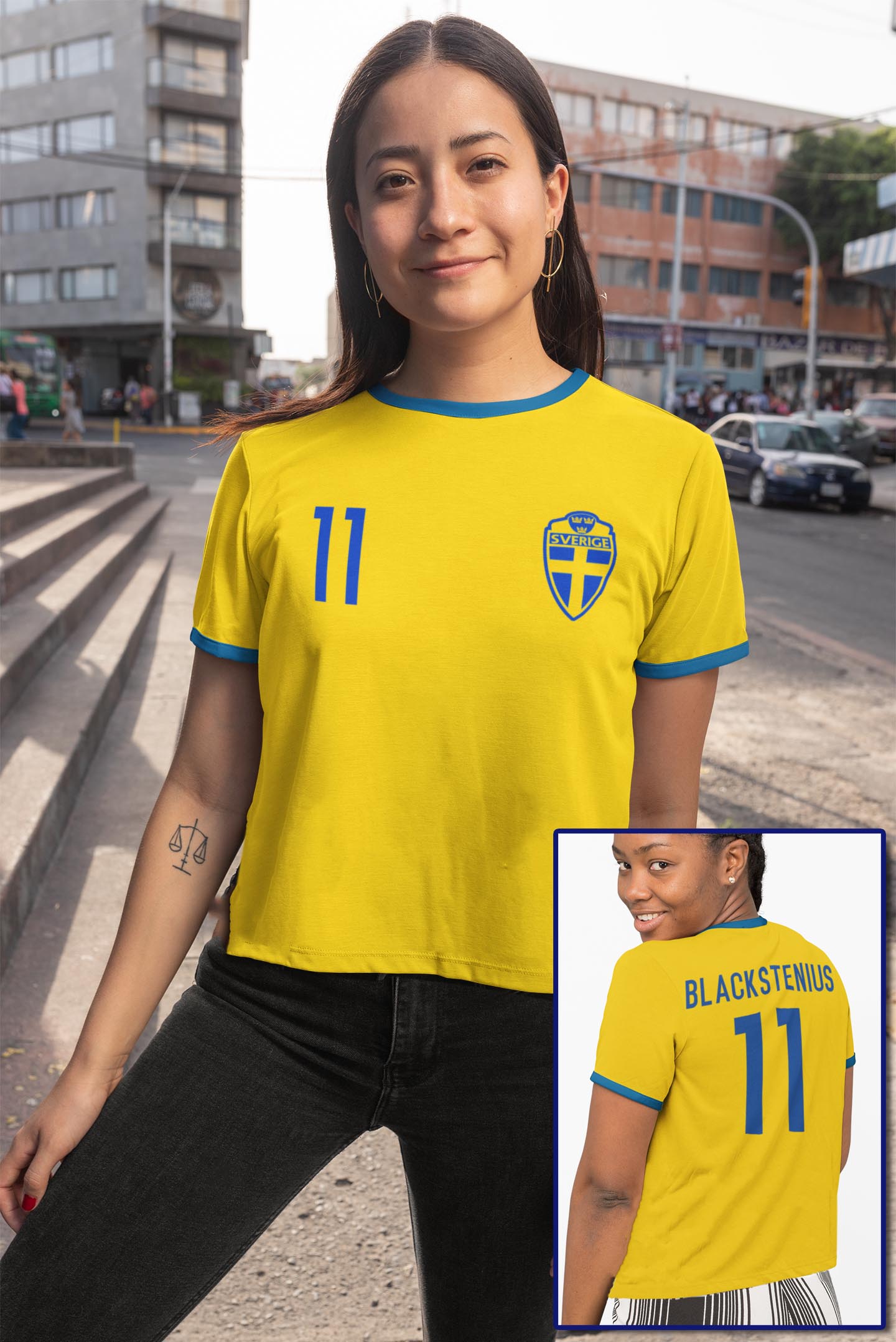 Bröstet pryds av ett stilrent Sverige-emblem på ena sidan och siffran 11 på den andra. På ryggen finns namnet och numret Blackstenius 11 – en blinkning till Sveriges Dam Landslag populära anfallare.