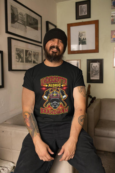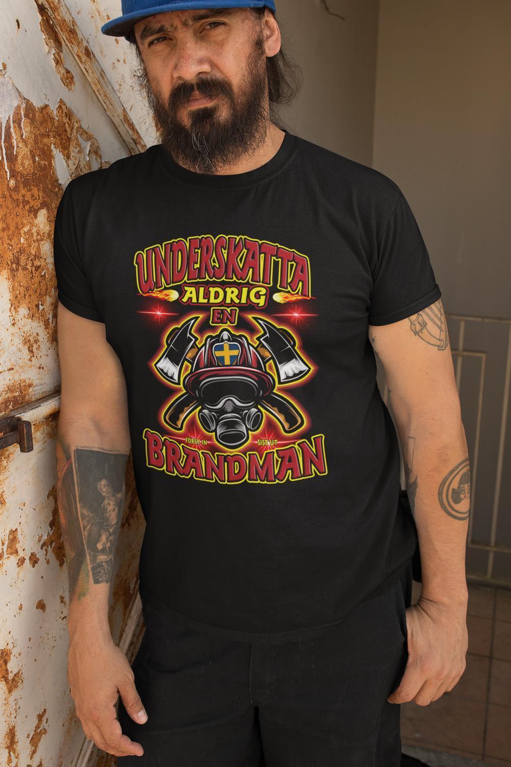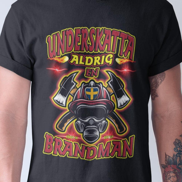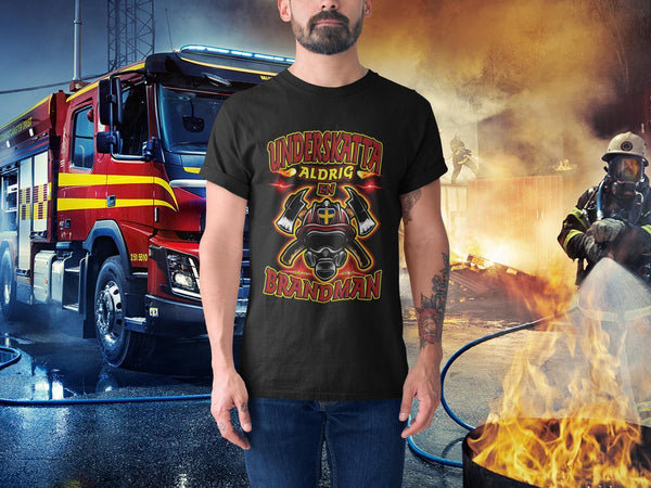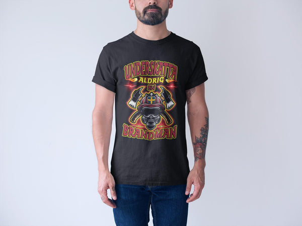 Svart t-shirt Underskatta aldrig en brandman design i 100% bomull