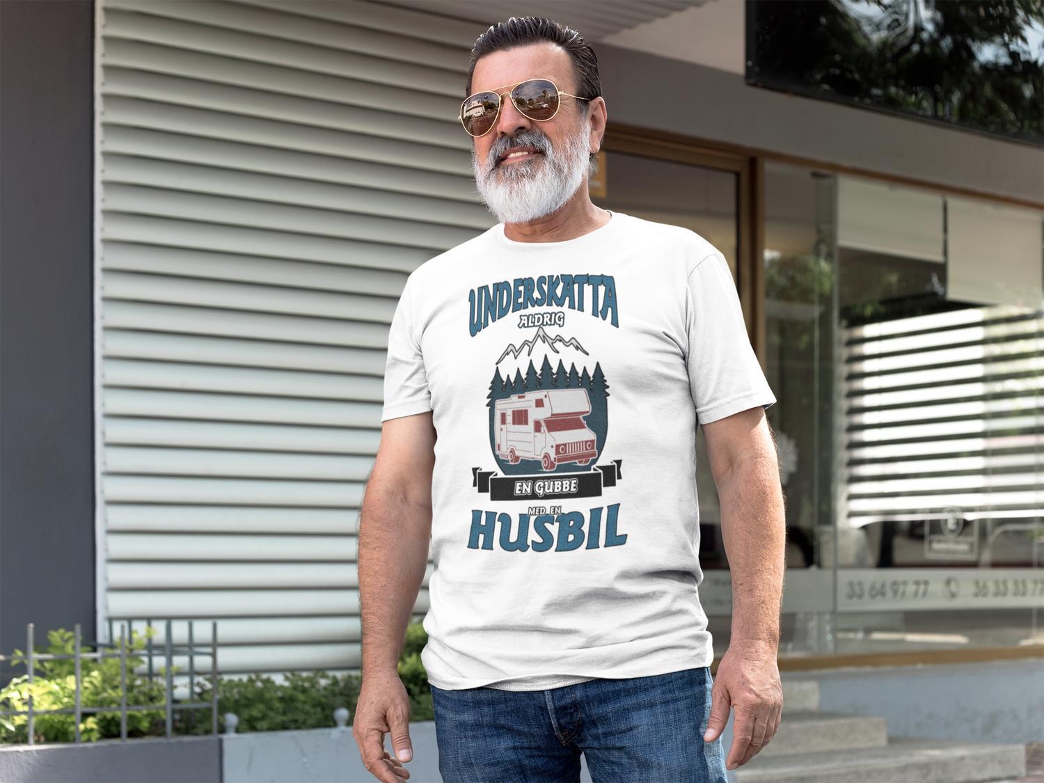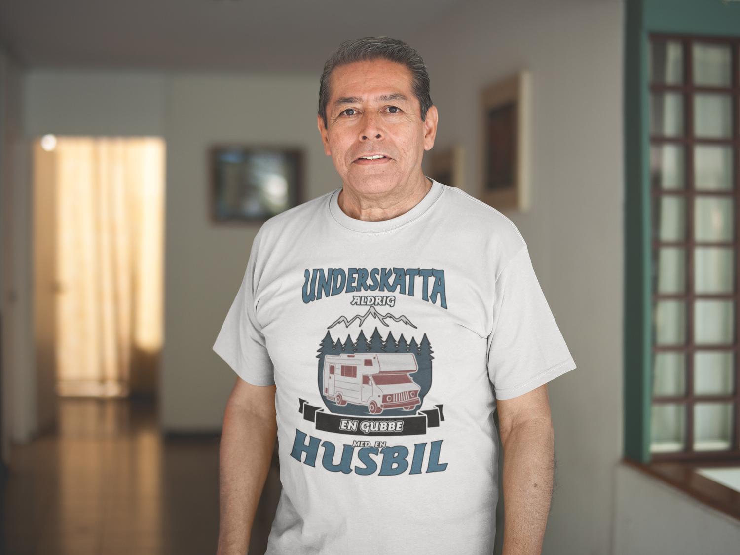 Underskatta aldrig en gubbe med en husbil vit t-shirtVit 160g t-shirt med husbil design100% bomull