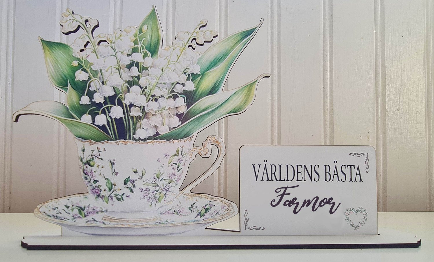 Överraska mamma med en charmig och kärleksfull gåva! Denna vackra dekoration är laserskuren och färgstarkt tryckt på MDF – en tekopp fylld med liljekonvaljblommor, symbolen för omtanke och kärlek. Bredvid koppen står det hjärtevärmande budskapet "Världens bästa Farmor ".