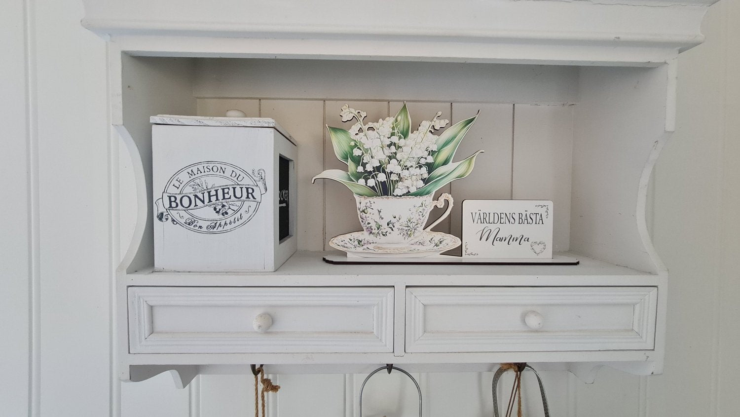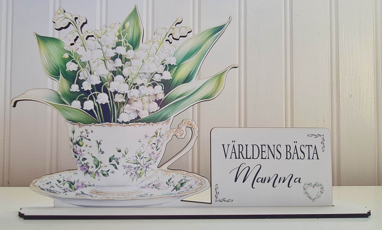 Överraska mamma med en charmig och kärleksfull gåva! Denna vackra dekoration är laserskuren och färgstarkt tryckt på MDF – en tekopp fylld med liljekonvaljblommor, symbolen för omtanke och kärlek. Bredvid koppen står det hjärtevärmande budskapet "Världens bästa Mamma".